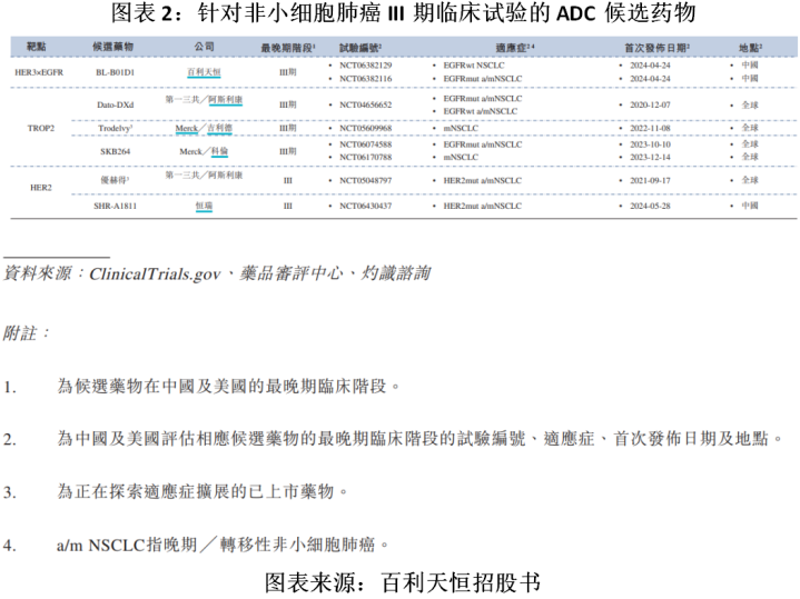 此外,截至最后实际可行日期,已有超过20种针对非小细胞肺癌的ADC候选药物正在进行临床开发。其中,进入III期临床试验的共有6种,BL-B01D1是全球首个亦是唯一进入III期临床开发的双特异性抗体ADC。