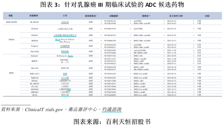 在乳腺癌治疗方面,截至最后实际可行日期,已有超过20个ADC候选药物正在针对乳腺癌进行临床开发,其中进入III期临床试验的共有17种,包括百利天恒的BL-B01D1和BL-M07D1。
