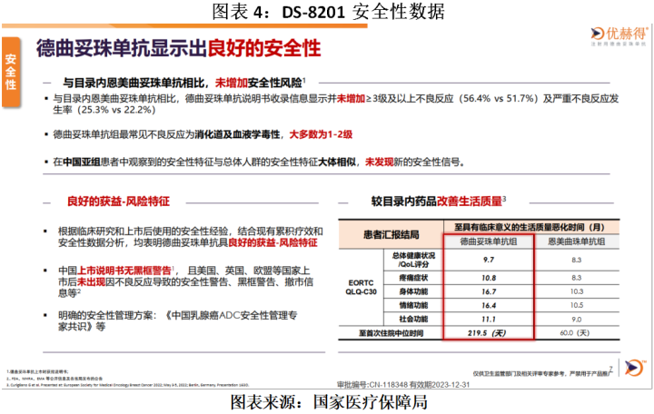 然而,作为BL-B01D1的比较对象,根据国家医疗保障局公示的DS-8201申报材料显示,与恩美曲妥珠单抗相比,DS-8201说明书收录信息显示并未增加≥3级及以上不良反应(56.4%vs51.7%)及严重不良反应发生率(25.3%vs22.2%)。